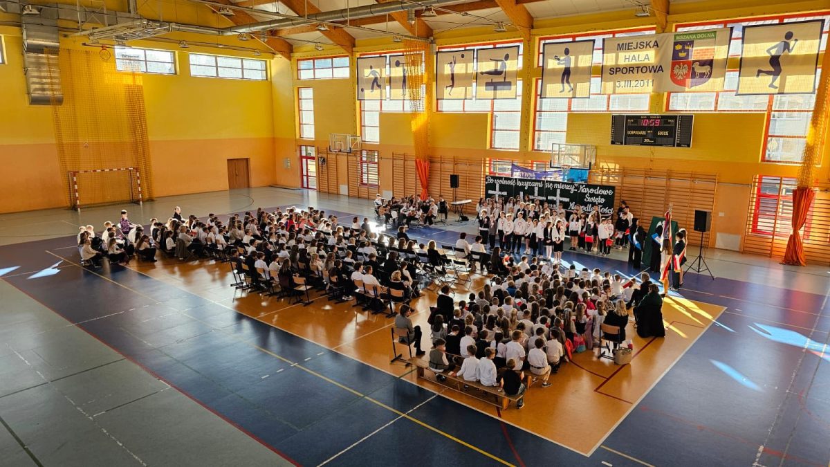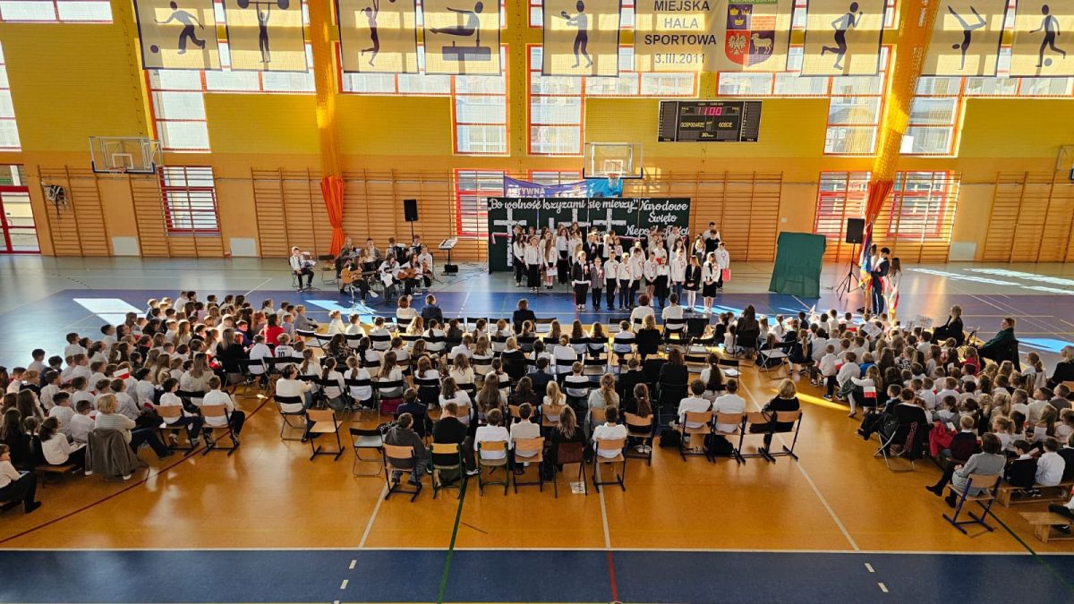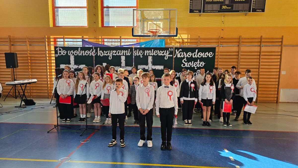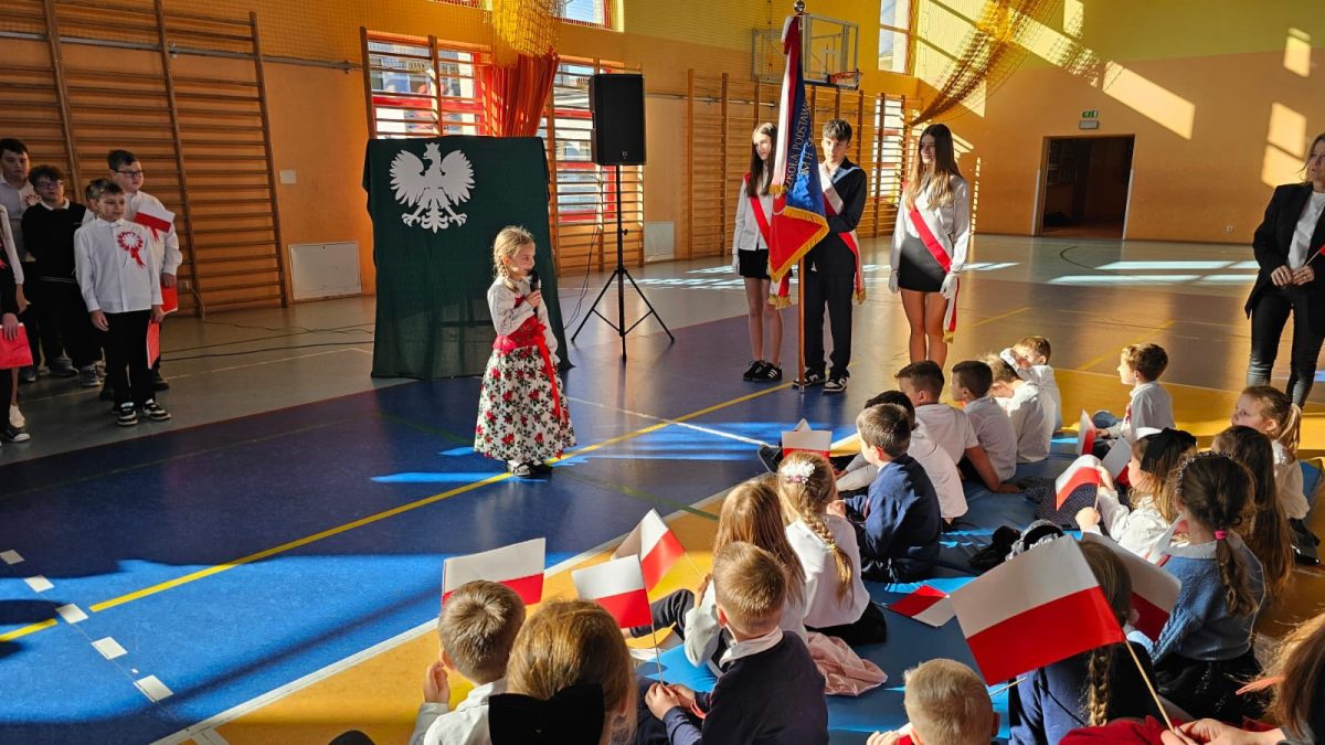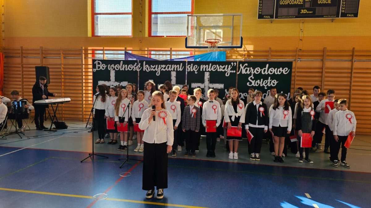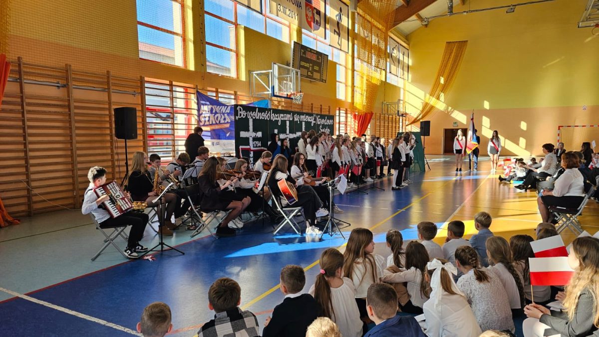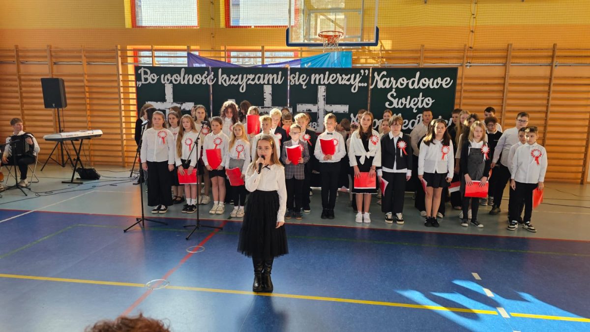 Z okazji zbliżającego się 11 listopada w naszej szkole odbyła się uroczysta akademia, w której uczestniczyła cała społeczność szkolna. W podniosłym nastroju, z muzyką Szopena, z poezją i pieśnią patriotyczną, w poczuciu wspólnoty i dumy narodowej, włączyliśmy się w obchody Narodowego Święta Niepodległości. To wspaniałe święto, pełne radości, ale droga do niego była długa i ciężka, naznaczona cierpieniem i krwią wielu pokoleń… Część artystyczna przygotowana przez uczniów klas piątych i szkolny zespół muzyczny raz jeszcze przybliżyła te fakty historyczne i wzruszyła muzyką i słowem. W całość włączyli się najmłodsi uczniowie – wierszem, piosenką, transparentami i chorągiewkami. To była piękna uroczystość!